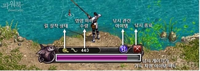 글루딘 마을에서 즐길 수 있는 미니 게임으로, 낚시터 상인에게서 낚싯대와 릴, 미끼를 구매해 낚시를 즐길 수 있다. 잡은 물고기는 NPC에게 팔아서 '베리'로 환전할 수 있고, 특정 물고기의 경우는 판매 시 일정 확률로 높은 등급의 제작 재료 아이템을 지급 받는다. 환전한 베리로는 각종 아이템으로 교환 가능하다.