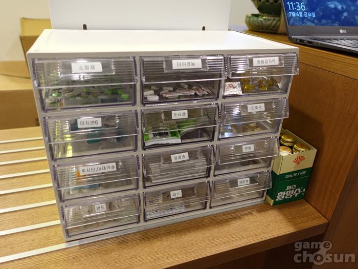 사옥을 들어가자마 입구에서 맞이한 비상약품들 = 게임조선 촬영