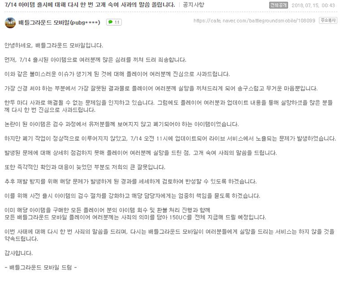 이후 15일 오전 추가 사과 공지 및 해당 아이템이 노출된 사항에 대해 아이템 폐기 작업이 정상적으로 이뤄지지 않은 결과임을 밝히고, 사전 출시 아이템 검수 절차 강화 및 해당 담당자에 대한 엄중한 책임을 약속했다.