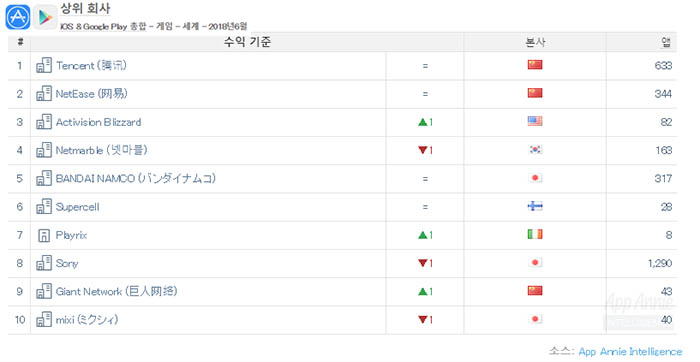 상위 회사 탑10에는 텐센트와 넷이즈가 1-2위로 변동이 없고 3위는 액티비전블리자드, 4위는 넷마블로 두 회사의 순위는 서로 자리를 바꿨다.