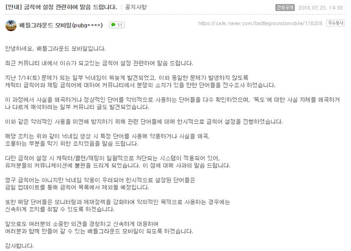 금칙어 설정관련 공지를 통해 ‘배틀그라운드모바일’은 지난 14일 문제가 되는 닉네임 발견 이후 동일한 문제가 발생하지 않도록 캐릭터 금칙어와 채팅 금칙어에 커뮤니티에서 분쟁의 소지가 있을 만한 단어를 전수조사했고, 이 목록에 ‘독도’가 포함된 것임을 설명했다.