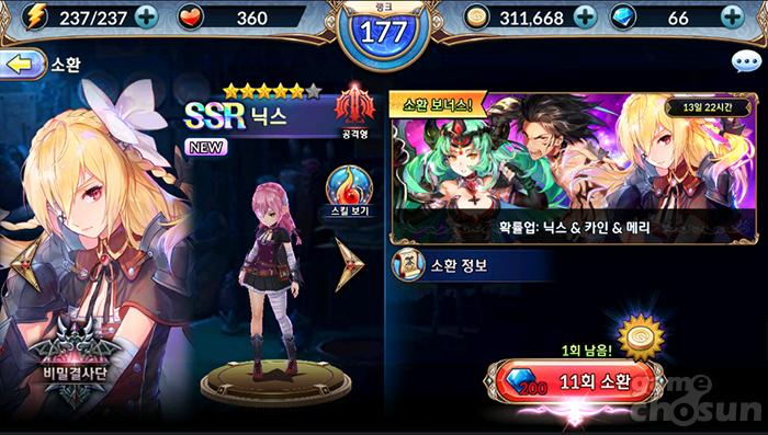 집행자 닉스는 이벤트 뽑기에서 등장하는 신규 SSR로 암속성 공격형 캐릭터다.