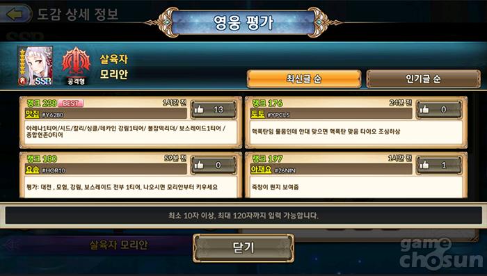 영웅 평가 게시판 시스템도 추가됐다. 도감에서 원하는 캐릭터를 선택 후, 만년필 모양의 아이콘을 눌러 들어갈 수 있는 게시판으로 해당 캐릭터에 대한 유저의 평가를 확인할 수 있다. 각 평가에는 좋아요를 찍을 수 있어 어떤 평가가 좀 더 객관적이고 공감대를 형성하는지 확인할 수도 있다.