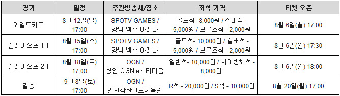 와일드카드전은 8월 12일 일요일 오후 5시에 강남 넥슨 아레나에서 치러지며, 정규리그 5위팀과 4위팀이 맞붙게 된다. 와일드카드전 승자는 8월 15일 수요일 오후 5시 같은 장소에서 정규리그 3위팀과 플레이오프 1라운드를 치른다. 이 경기의 승자가 8월 18일 토요일 오후 5시 상암 서울 OGN e스타디움에서 정규리그 2위팀과 플레이오프 2라운드 대결을 펼쳐 최종 승자가 결승에 진출한다.