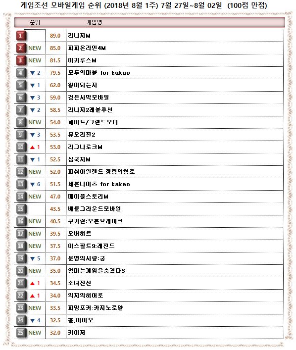 2018년 8월 1주 <게임조선> 모바일게임순위