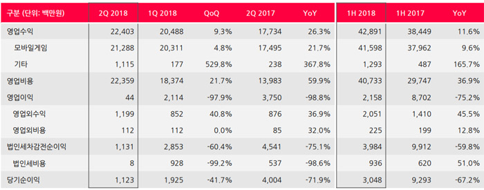 선데이토즈(대표 김정섭)가 2018년 상반기 및 2분기 실적을 3일 발표했다.
