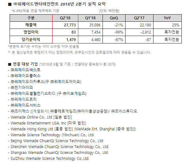 8일 위메이드엔터테인먼트(대표 장현국)는 2018년 2분기 실적을 발표했다.