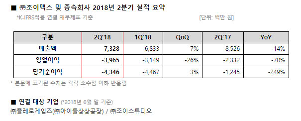 국제회계기준 적용 연결 재무제표 기준 조이맥스는 2분기 매출액 약 73억원, 영업손실은 약 40억원으로 집계됐다.