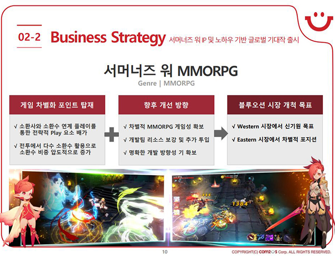 이 외에도 ‘서머너즈워’ IP(지식재산권) 확장을 위한 완구, 소설, 코믹스와 같은 콘텐츠 글로벌 파트너와 개발 및 ‘서머너즈워’ MMORPG 개발에 박차를 가할 계획이다.