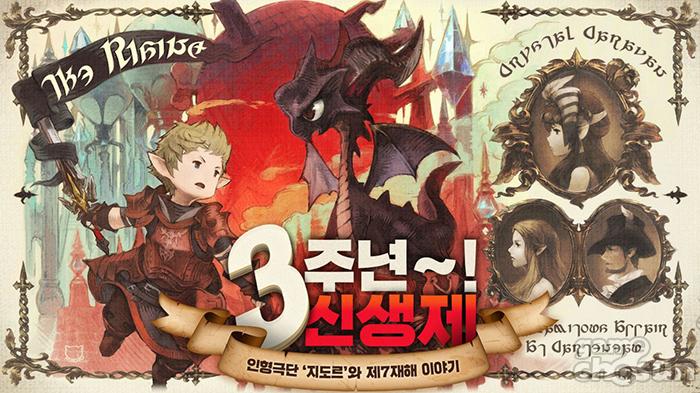 서비스 3주년을 맞이한 ‘파이널판타지14’는 3주년 신생제를 통해 이용자들에게 각종 혜택을 제공할 예정이다. 이용자는 인형극단 지도르의 극단 단장의 퀘스트를 통해 신생 축하주를 비롯한 각종 보상을 획득할 수 있다.