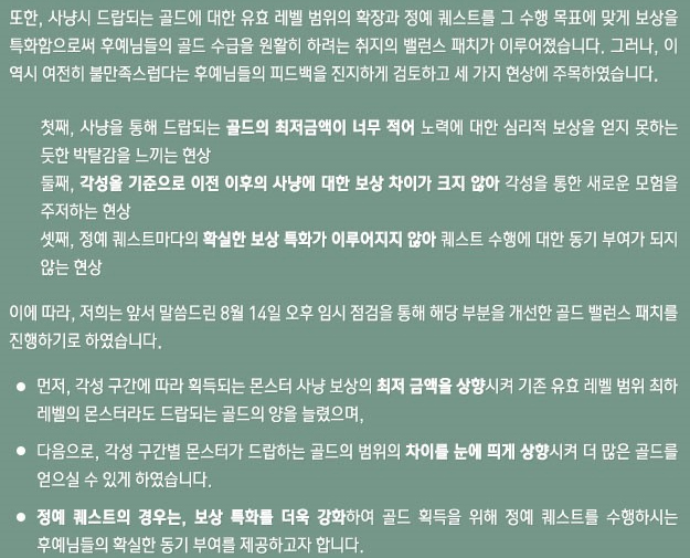 골드 밸런스는 몬스터 사냥 보상으로 얻는 골드 최저 금액을 상향시켜 최하 레벨의 몬스터라도 골드를 얻을 수 있다. 정예 퀘스트는 보상을 특화 시켜 확실한 동기부여를 제공하는 것이 목표다.