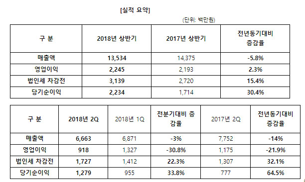 매출은 67억원, 영업이익은 9억원, 당기순이익은 13억원을 기록했고 상반기 매출은 135억원, 영업이익 22억원, 당기순이익 22억원이다.