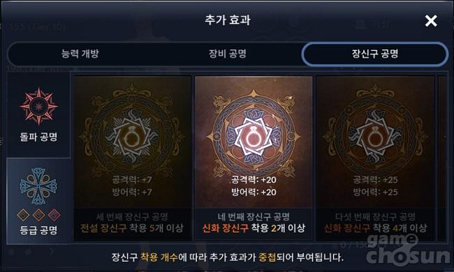 기존의 능력 개방 및 장비 공명에 이어서 '장신구 등급 공명'도 추가됐다. 장신구 공명은 현재 착용 중인 장신구 등급의 개수에 따라 추가적인 공격력 및 방어력을 부여받는다.