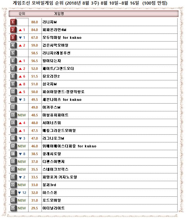 2018년 8월 3주 <게임조선> 모바일게임순위
