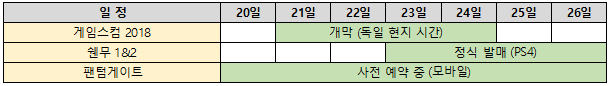 8월 넷째 주 주요 신작 게임은 PS4용 타이틀 '쉔무1&2'와 넷마블의 신작 모바일게임 '팬텀게이트'로 채워진 가운데, 유럽 최대 게임쇼 '게임스컴 2018'의 개막을 앞두고 있다.