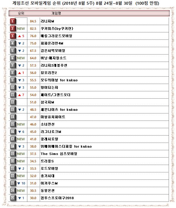 2018년 8월 4주 <게임조선> 모바일게임순위