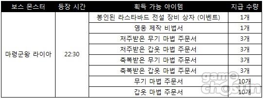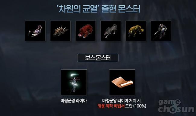 차원의 균열 던전에서는 '마령군왕 라이아'가 보스 몬스터로 등장하는데, 매일 22시 30분에 만나볼 수 있다. 해당 보스 몬스터에게서는 '봉인된 라스타바드 전설 장비 상자(이벤트)' 등을 획득할 수 있으며 특히 영웅 제작 비법서를 확정적으로 얻을 수 있기에 큰 인기를 끌 것으로 보인다.
