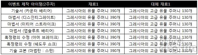 발록의 유물 상자 전설 등급 아이템 제작 2주차 목록도 공개됐다. 따라서 1주차 전설 등급 아이템 제작 목록은 삭제되었으며 2주차 전설 등급 아이템 목록과 재료는 다음과 같다.