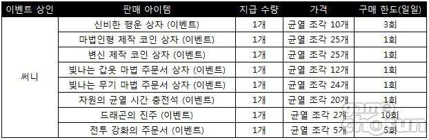 일반 몬스터를 처치할 시에는 균열 조각 아이템을 얻을 수 있는데 해당 아이템을 모아서 이벤트 상인 NPC '써니'에게 가져다줄 경우 아래와 같은 아이템과 교환 가능하다.
