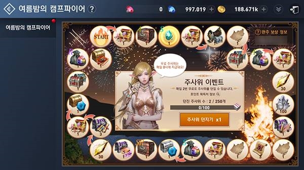 9월 6일부터 9월 20일까지 2주에 걸쳐 진행되는 주사위 이벤트인 여름밤의 캠프파이어도 주목할만 하다. 주간 퀘스트 클리어, 시공의 균열 보상 획득, 장비 던전 완료 등 각종 일일 콘텐츠를 플레이함으로써 쌓은 포인트로 주사위를 굴려 보상을 받으면 된다.