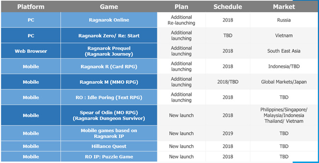 올 상반기 한국에서 흥행에 성공한 '라그나로크M'은 오는 10월 글로벌 서비스를 준비 중이다. 또한 연내에 카드형 RPG '라그나로크R'은 인도네시아에서 선보일 예정이며, 모바일 액션 RPG '라그나로크: 스피어오브오딘'은 동남아지역에서 비공개테스트를 마친 상태다.