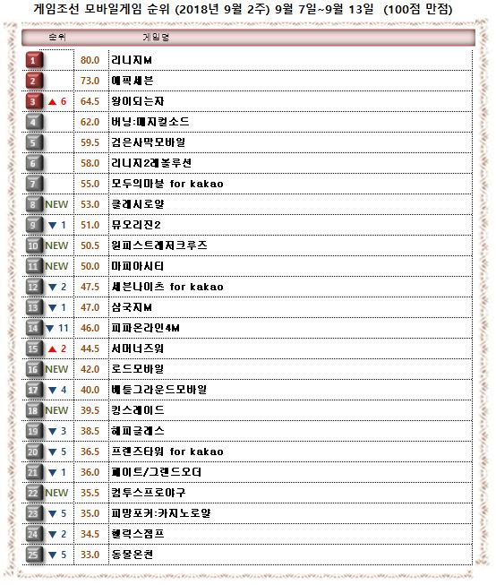 2018년 9월 1주 <게임조선> 모바일게임순위