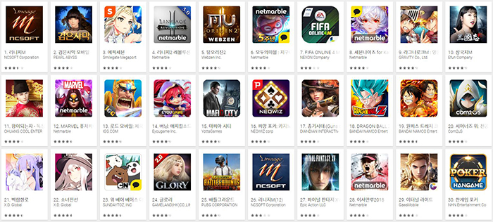 2018년 9월 17일 구글플레이 게임부문 최고 매출 순위 갈무리