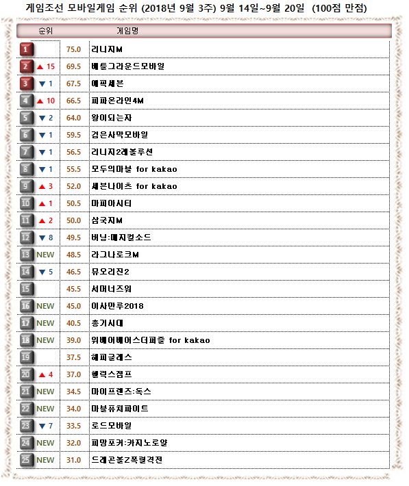2018년 9월 3주 <게임조선> 모바일게임순위