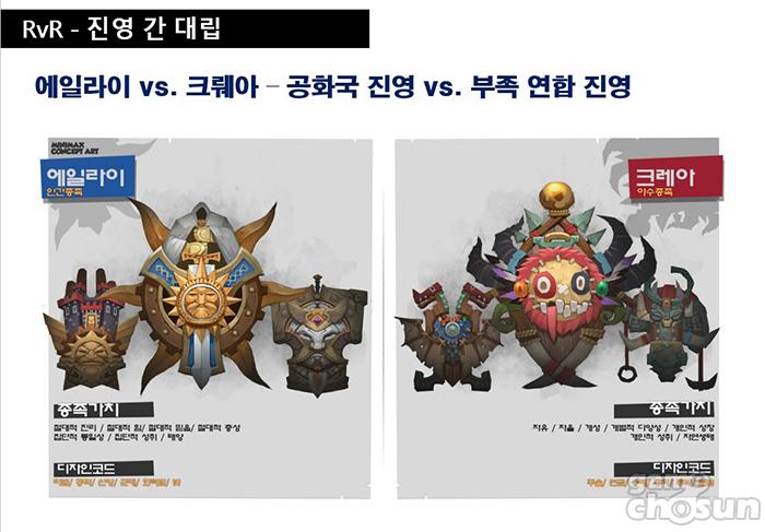 먼저 ‘RvR’을 대표하는 것은 두 종족인 에일라이과 크뤠아이다. 에일라이는 인간을 대표하는 종족으로 문명과 기술을 사용하는 것이 특징이다. 또 게임 중 90초 마다 변경되는 낮과 밤 중 낮에 특수능력 및 시야의 이득을 획득하게 된다. 야수를 대표하는 크뤠아는 에일라이와 반대로 신체와 자연을 사용한다. 밤에 특수 능력과 시야의 이득을 가진다. 이를 이런 차이가 게임 속에 반영된다.