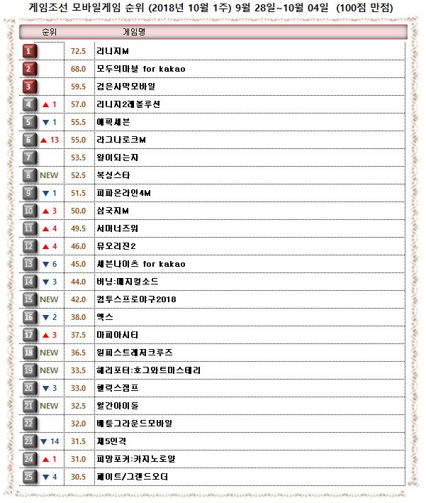 2018년 10월 1주 <게임조선> 모바일게임순위