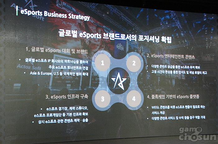 액토즈소프트의 4가지 전략은 글로벌 e스포츠 대회 및 브랜드 확보, e스포츠 엔터테인먼트 콘텐츠 제작, ‘액토즈 아레나’와 같은 e스포츠 인프라 구축, 블록체인을 기반으로 한 e스포츠 플랫폼 제작이다.