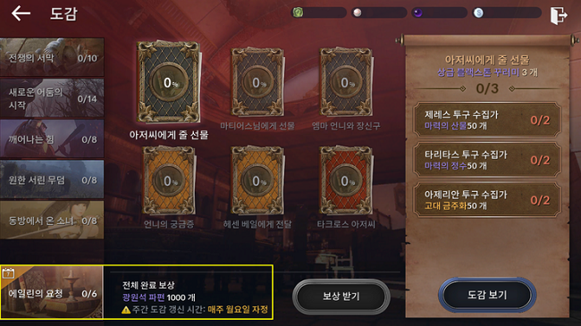 도감 시스템에는 '주간 도감'이 추가되었는데, 해당 도감은 매주 월요일에 초기화된다. 따라서 정해진 시간 내에 도감을 완성하고 보상을 획득하는 것이 포인트다. 우선 8일부터 14일까지는 '에일린의 요청' 도감이 오픈되며 이후 15일부터 21일까지는 '타크로스의 요청' 도감이 열린다.