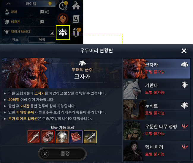 우두머리 현황을 보다 명확하고 쉽게 파악할 수 있도록 게임 화면 좌측 상단에 '우두머리 현황판'을 추가했다. 이를 통해 월드 보스 및 나이트메어 우두머리의 소환 유무와 종류, 주요 보상 아이템 등을 확인할 수 있다.