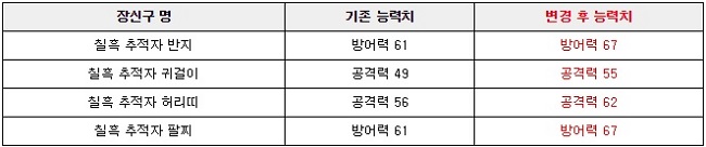 심연 등급 장신구 '칠흑 추적자 목걸이'가 새롭게 추가되었으며, 해당 아이템은 용맹의 땅 6단계와 길드 정예 토벌, 샤카투 상점, 장신구 상점 등에서 획득할 수 있다. 또, 기존 심연 등급의 장비 능력치도 상승했는데, 주무기는 공력력 30, 보조 무기는 공격력 및 방어력 각 15, 방어구는 방어력 30이 증가했다. 이외에도 기존 칠흑 추적자 시리즈 장신구의 능력치도 일괄적으로 상향 조정했다.
