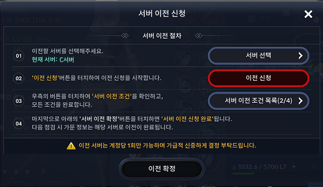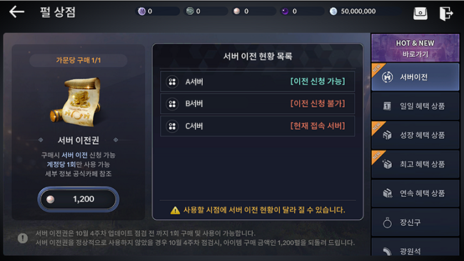 이날 업데이트에서 이용자들이 가장 주목할만한 점은 '서버 이전권'의 판매다. 지난 업데이트를 통해서 서버 이전 신청을 진행한 바 있으며, 이번에 출시된 서버 이전권을 구매하면 원하는 서버로의 최종 신청이 가능하다. 서버 이전권은 10월 4주차 업데이트 점검 전까지 구매 및 사용할 수 있다.