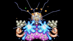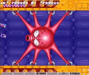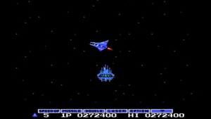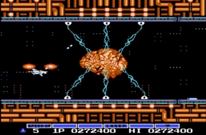 그라디우스 1편의 최종보스인 마더 컴퓨터와 행성을 탈출하는 엔딩을 재현한 모습임을 쉽게 알 수 있다.
