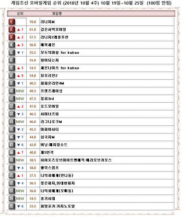 2018년 10월 4주 <게임조선> 모바일게임순위