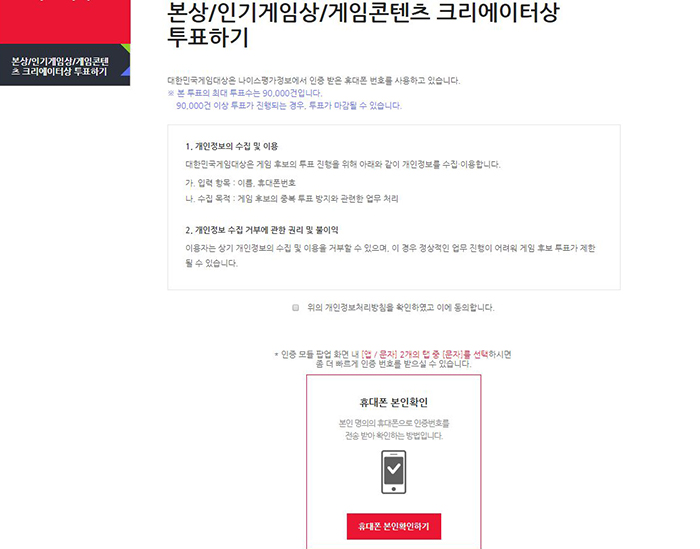 게임 후보의 중복 투표 방지를 위해 휴대폰 본인확인을 통해 투표를 진행할 수 있으며, 인증이 완료되면 각 후보에게 투표할 수 있다. 단, 투표의 최대 투표수는 9만 건으로 조기에 투표가 마감될 수 있다.