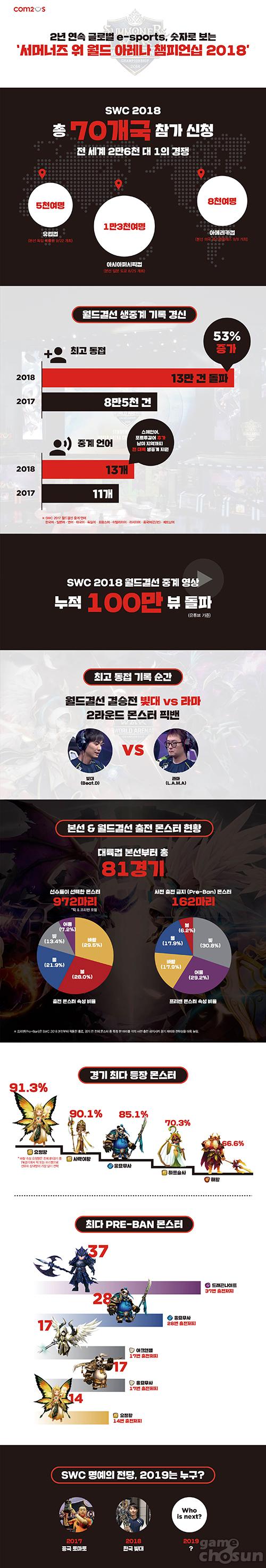 모바일 게임 기업 컴투스(대표 송병준)는 최근 막을 내린 ‘서머너즈워:천공의아레나(이하 서머너즈워)’ 세계 e스포츠 축제 ‘SWC 2018’의 주요 경기 내용과 기록들을 인포그래픽에 담고 전 세계에 소개했다.