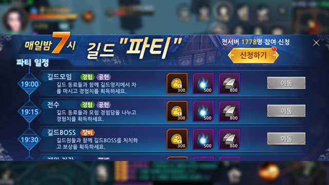 일명 '길드 파티 이벤트'라 불리는 이 이벤트는 매일 접속 시 해당 아이콘을 눌러 참여 신청을 할 수 있다. 19시가 되면 알림을 통해 해당 이벤트가 시작됐음을 알 수 있다. 물론 참여하지 않고 원래 하고자 하는 콘텐츠를 즐기는 것도 가능하다.