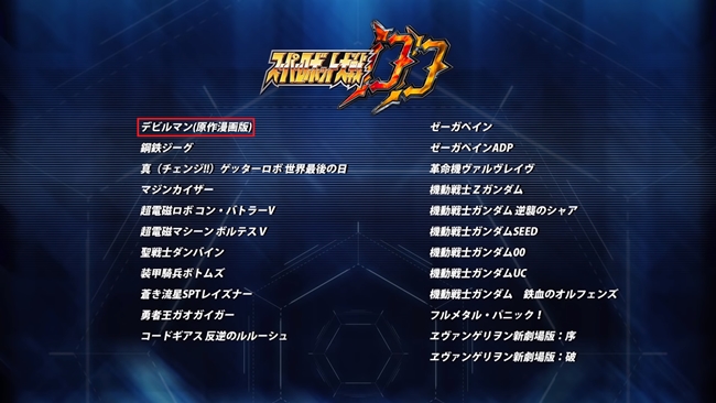 그나마 일각에서는 마징가Z, 겟타로보와 같이 다이나믹 프로덕션의 TV 애니메이션, 극장판에서 슈퍼로봇과 같은 사이즈로 거대화하여 활약한 것을 보고 등장한 게 아닌가 추측하기도 했지만 슈퍼로봇대전DD의 트레일러 영상 마지막에 공개된 참전작 리스트 최상단에서는 '데빌맨(원작 만화판)'이라는 내용을 확인할 수 있었습니다. 즉 슈퍼로봇대전DD에는 거대화의 흔적이라고는 찾아볼 수도 없는 등신대의 안티히어로인 데빌맨만 나온다는 의미죠.