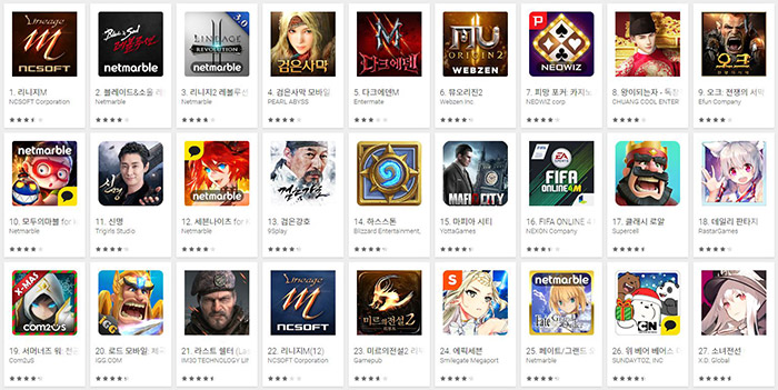 ‘블레이드앤소울레볼루션’의 상승세와 함께 구글플레이 최고 매출 순위의 상위권은 MMORPG가 차지했다. 탑10의 게임 중 7개의 게임이 MMORPG로 나타났으며, 10위권에도 2개의 MMORPG가 순위에 올랐다.