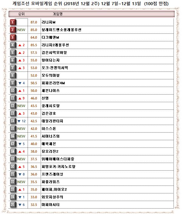 2018년 12월 2주 ‘게임조선’ 모바일게임순위