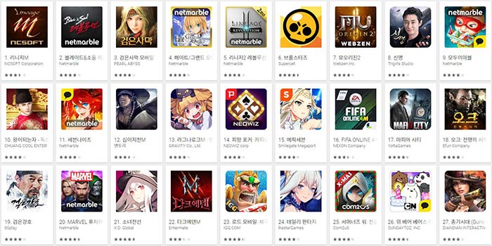 기존 인기게임들이 순위경쟁을 펼치는 가운데, 신작 ‘십이지천M’은 초기 이용자들의 인기를 모아 12위에 오르는 성적을 거두기도 했다. 또 출시 1개월이 지난 ‘브롤스타즈’는 6위를 지키며 매출 순위 상위권에 안착했다.