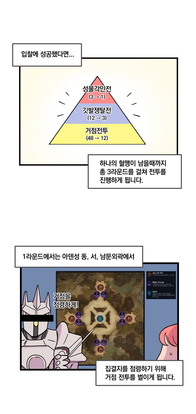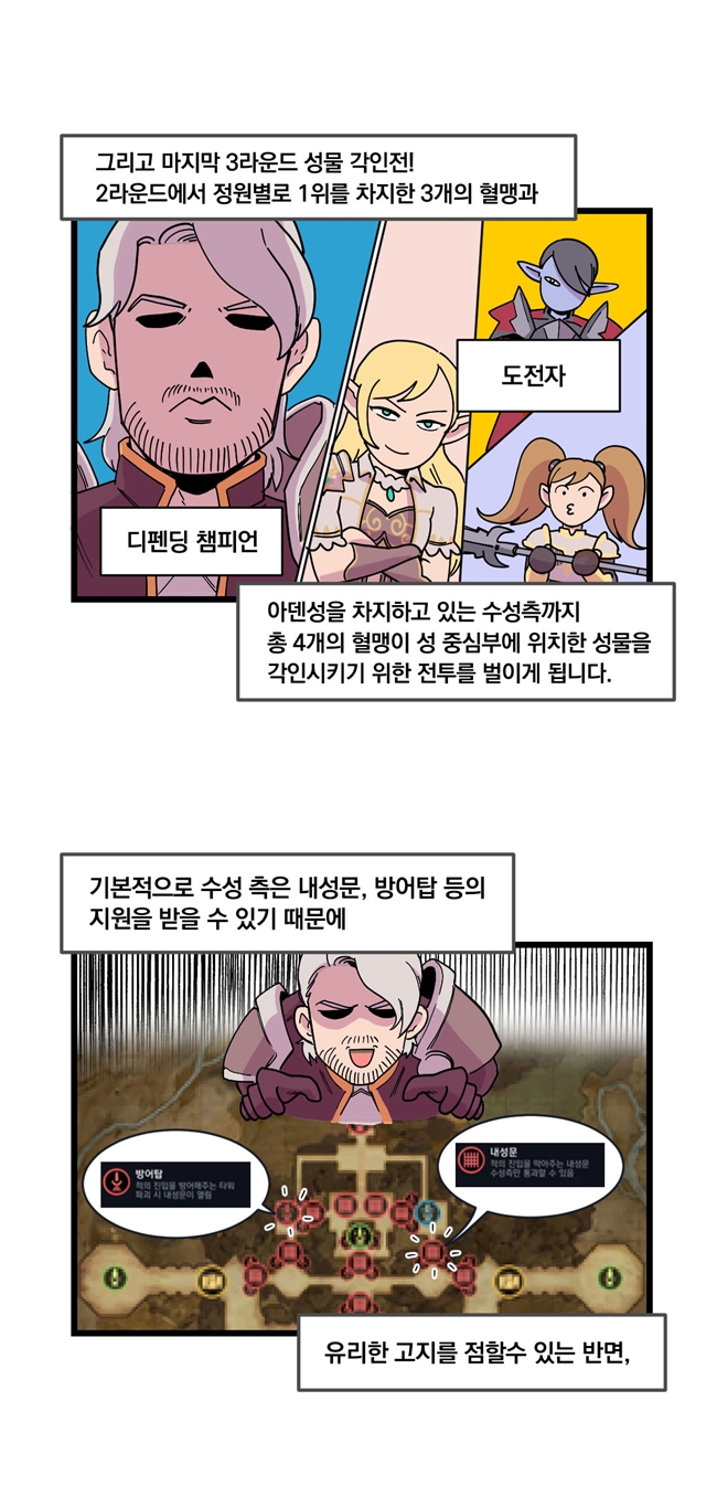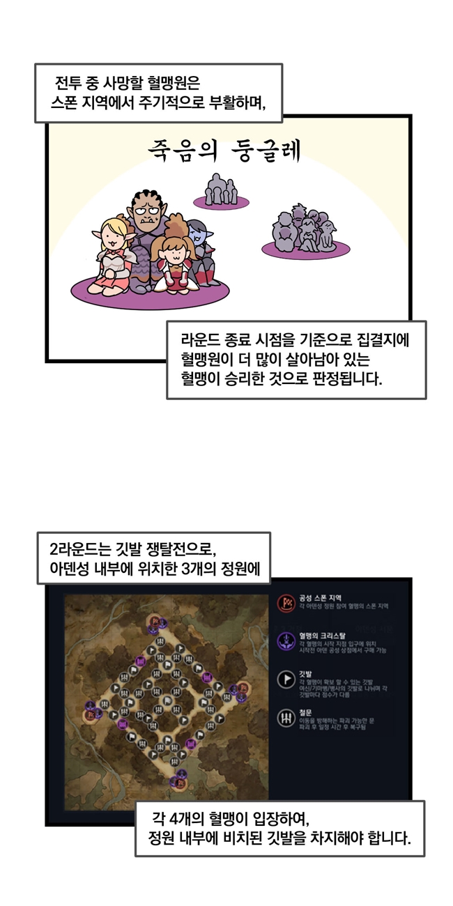 높은 포인트로 입찰 권한을 획득한 48개 혈맹은 각각 거점 전투, 깃발 쟁탈전, 성물 각인전이라는 3라운드의 전투 과정을 거쳐 아덴성을 차지할 수 있으며 아덴성을 차지하고 있는 동안에만 쓸 수 있는 칭호, 코스튬 등 명예 보상 외에도 고대 아덴성의 유물 등 막대한 혜택을 누릴 수 있는 것이 특징이다.