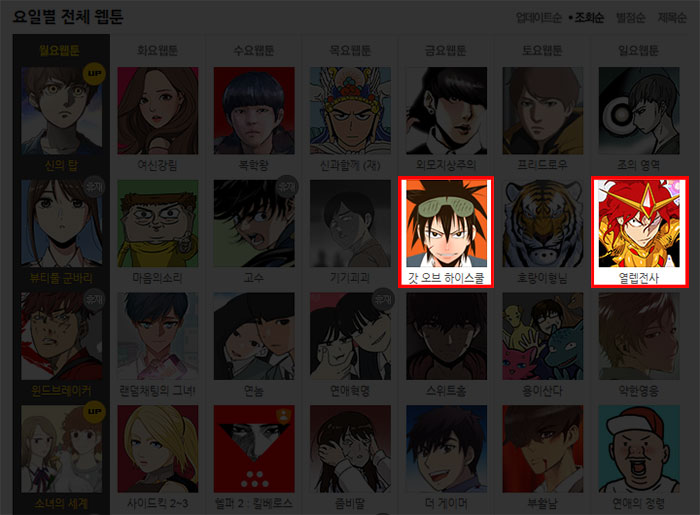 금요웹툰과 일요웹툰에서 상위권을 차지하고 있는 원작 웹툰 = 네이버 웹툰 페이지
