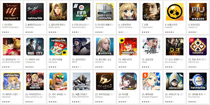 2019년 1월 28일 구글플레이 게임부문 최고 매출 순위 갈무리