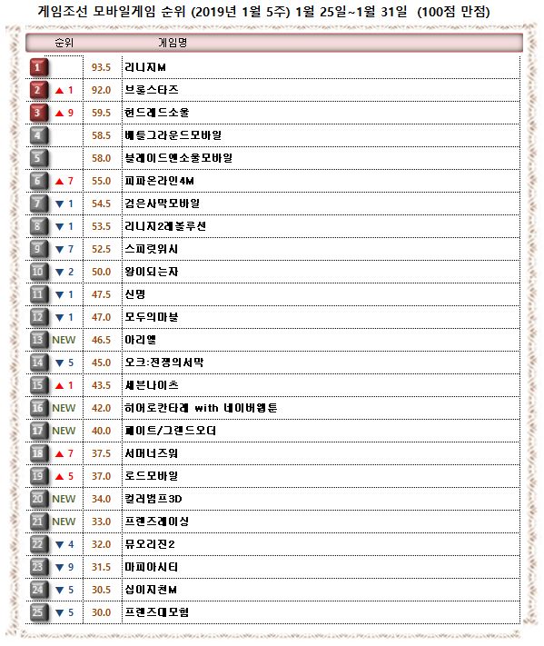 2019년 1월 5주 ‘게임조선’ 모바일게임순위