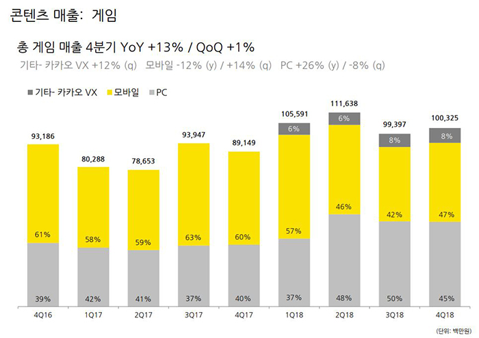 2018년 4분기 매출 중 광고 매출 1816억 원, 콘텐츠 매출 3143억 원, 기타 1770억 원인 것으로 발표됐다. 이중 게임이 포함된 콘텐츠 매출은 전년 대비 18% 상승했으며, 게임의 매출은 1003억 원을 차지했다. 게임 매출은 ‘프렌즈레이싱’, ‘창세기전:안타리아의전쟁’ 등의 신규 게임 출시로 소폭 상승했고, 모바일 플랫폼이 47%, PC 플랫폼이 45%, 기타- 카카오 VX가 8%를 기록했다.