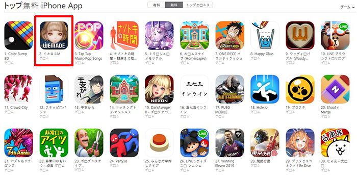 2019년 2월 21일 오전 일본 애플 앱스토어 무료 다운로드 게임부문 순위 갈무리